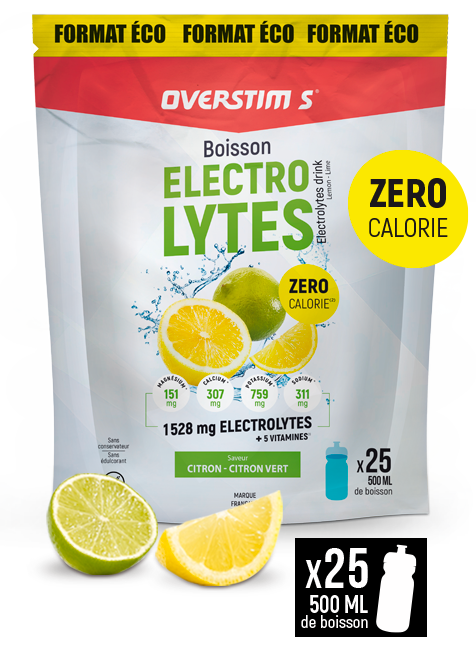 Calorie-free (4 kcal / 100 ml), the OVERSTIM.s electrolyte drink allows you to replenish electrolytes (mineral salts) eliminated through perspiration.